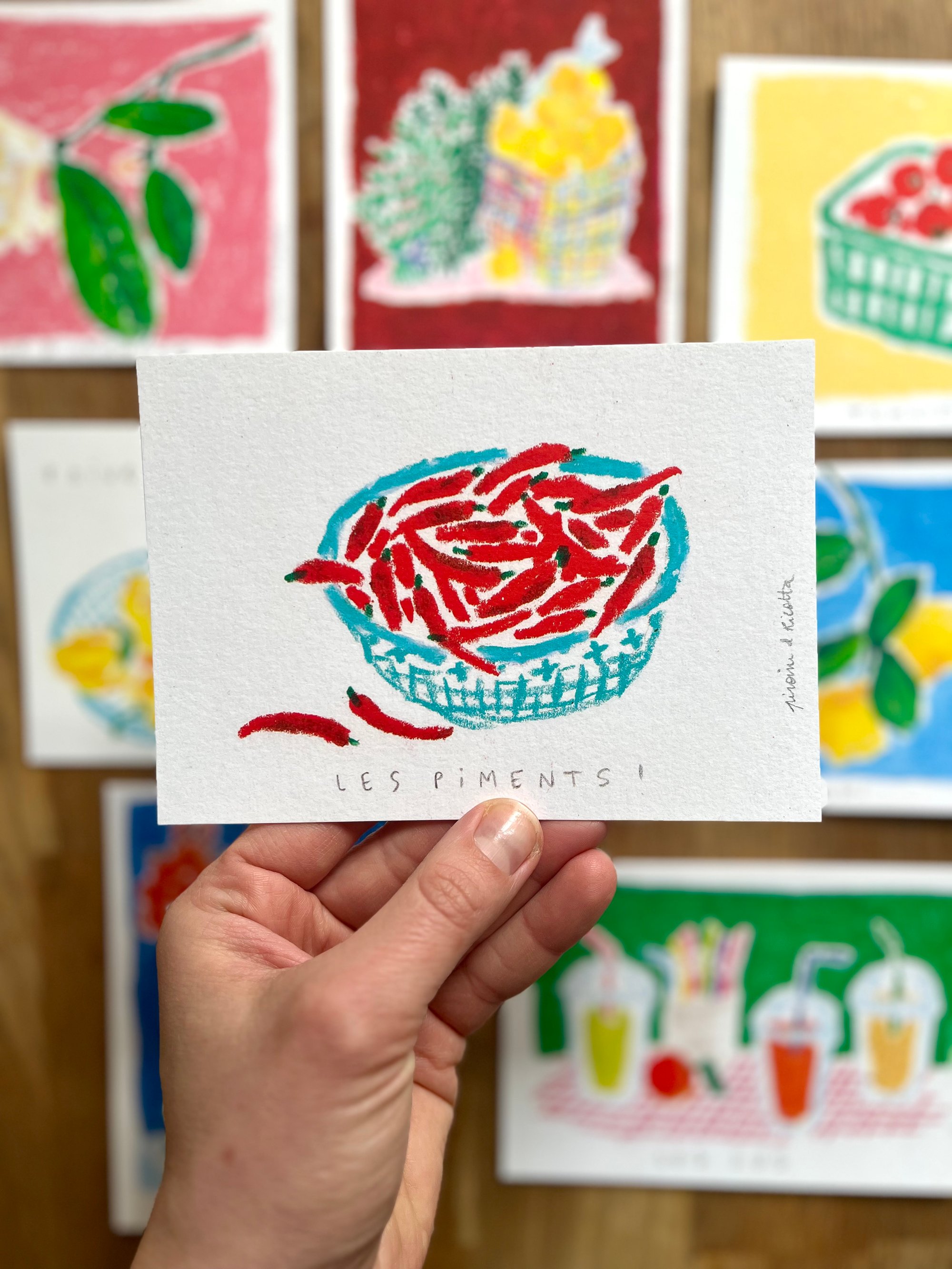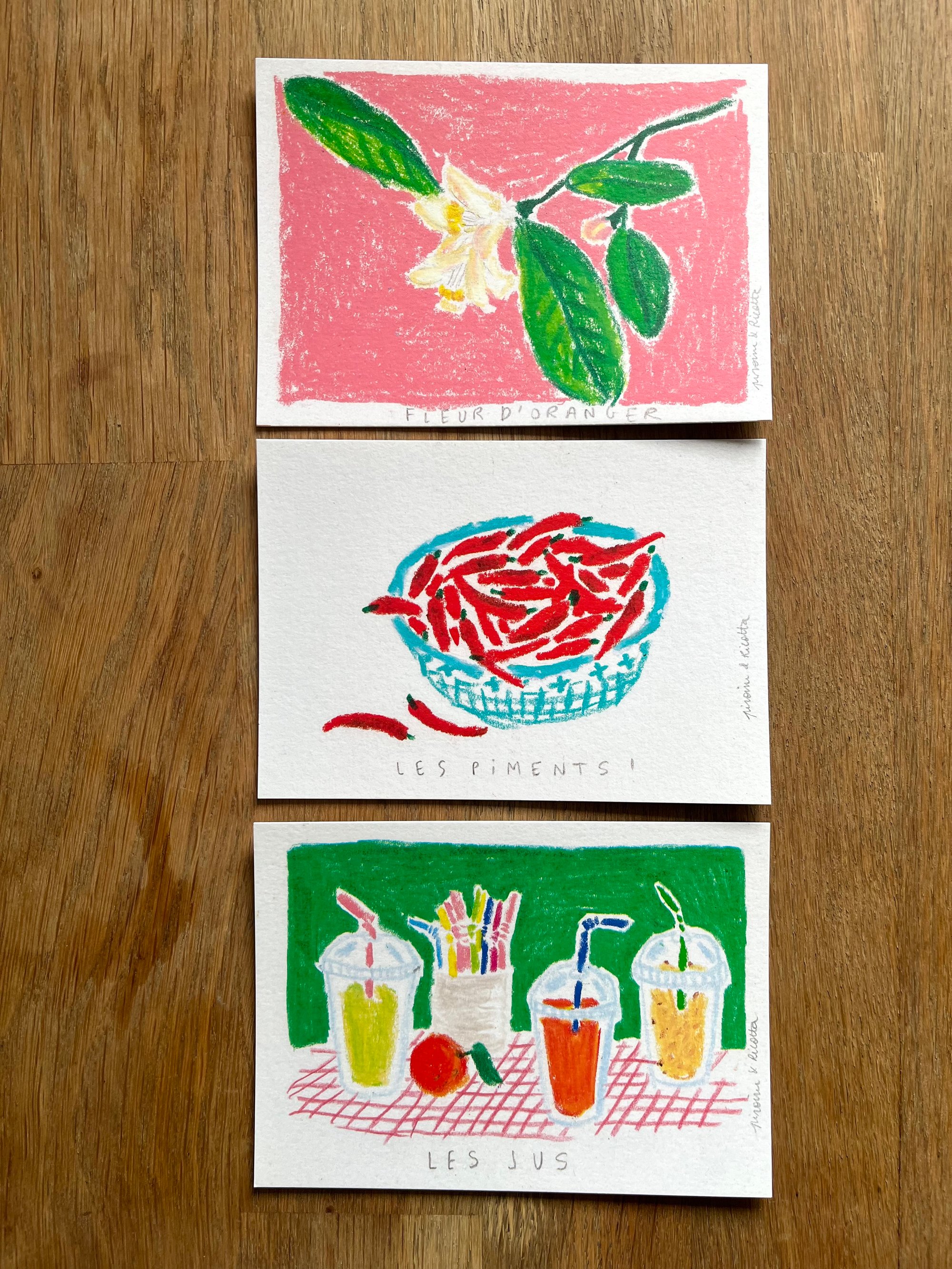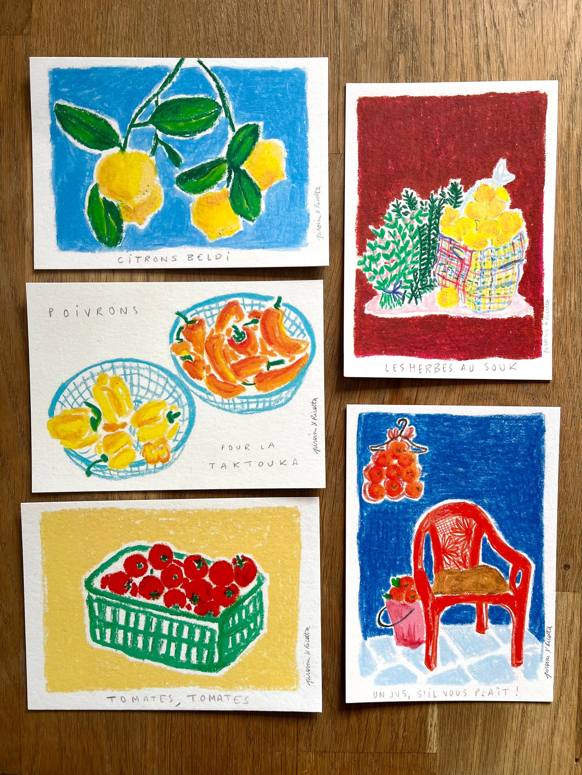 C'est tout ce que j'ai voulu mettre en dessinant ces cartes, des odeurs, des couleurs, des souvenirs de voyage comme des photos prises et stockées dans ma mémoire.